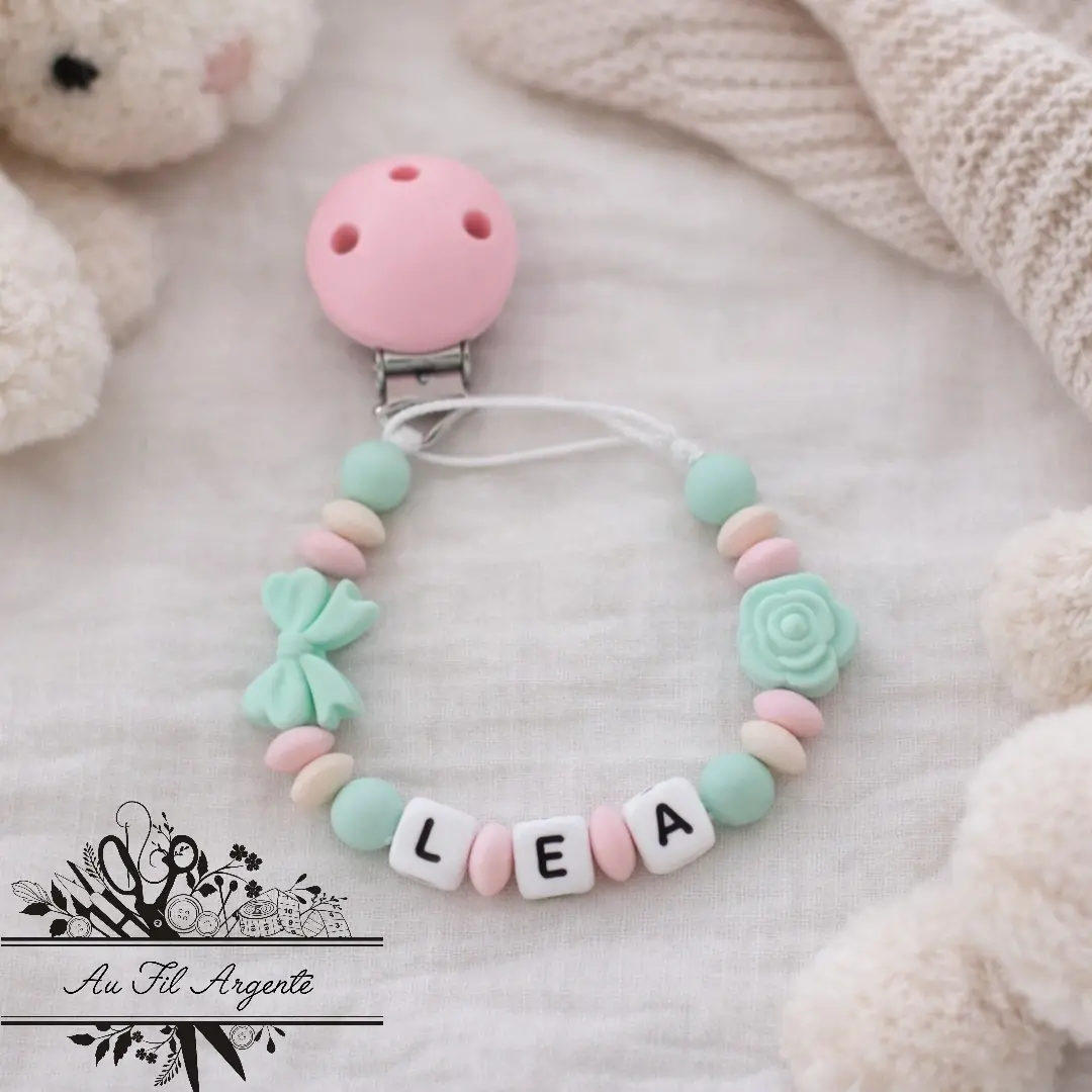 Perles Silicone Menthe et Rose / Fleur et Noeud
