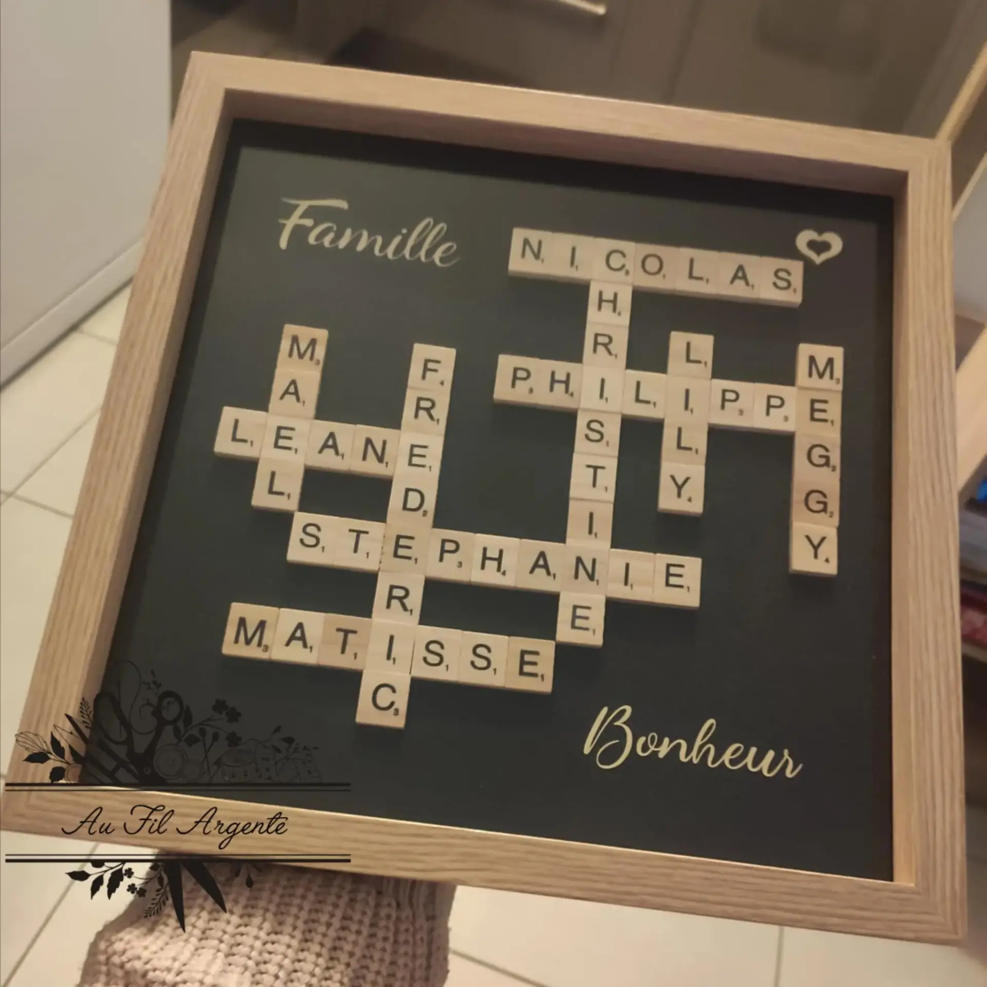 Cadre personnalisé style Scrabble – prénoms de votre famille, création unique.