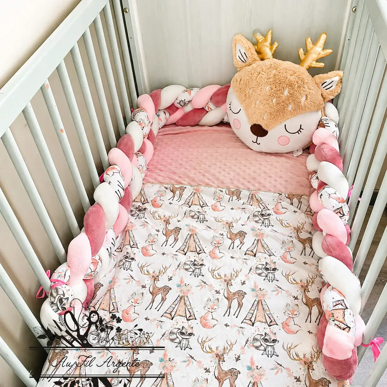 Cette tresse de lit 4 brins s’adapte parfaitement à tous les lits bébé et constitue également une idée de cadeau de naissance originale et personnalisée.